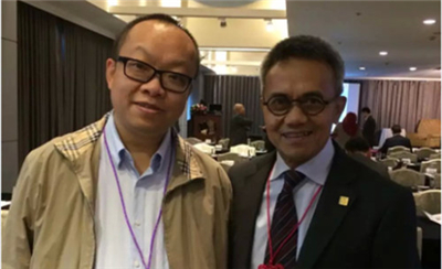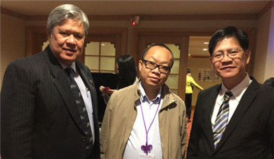 中海达副总裁胡炜与菲律宾籍的东南亚测绘协会高级副主席(右),兰道夫先生(Mr. Randolf)和菲律宾大地工程测量和地理信息学会主席(左),韦利诺先生(Mr. Avelino)合影