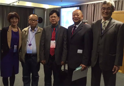 中海达副总裁胡炜、中海达国贸销售部销售经理梁伙连(左一)与菲律宾籍的东南亚测绘协会高级副主席兰道夫先生(中),台湾测绘业商业同业公会理事长高治喜先生(右二),台湾测绘业商业同业公会秘书长曹智广先生(右一)合影