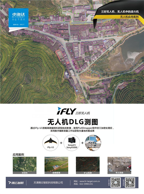 第二种是DLG矢量地形图获取,通过iFly-U1无人机采集数据,空三处理结算分析,摄影测量工作站进行立体采集,适用于中大范围的地形图数据制作。