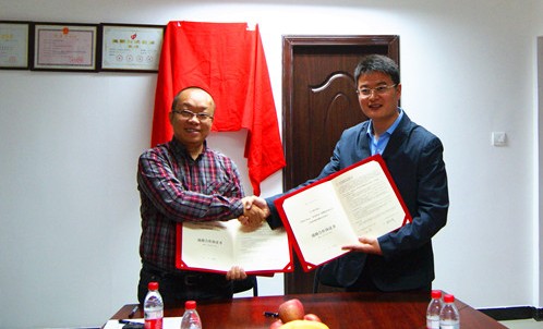 北京帝测科技发展有限公司总经理张向前(右)和中海达集团副总裁胡炜签署协议