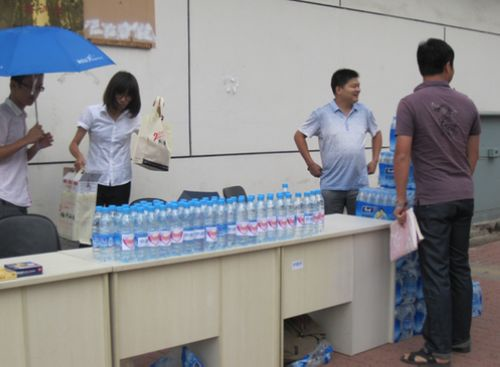 在天津,中海达天津分公司工作人员主动热情招呼前来考试的考生,向他们介绍中海达免费送水活动并递上带有中海达logo的矿泉水。
