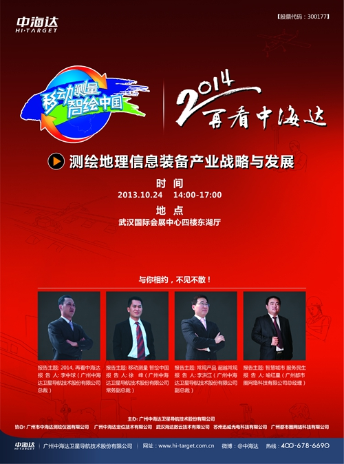 10月24日14:00-17:00,主题为“移动测量,智绘中国 - 2014,再看中海达!”的测绘地理信息装备产业战略与发展会议将在武汉国际会展中心四楼东湖厅召开。