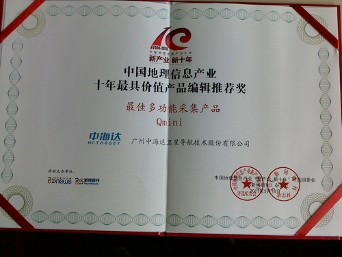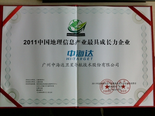 中海达作为国内研发、生产与销售GPS与GIS于一身的高科技上市公司,受到各专家的一致好评,最终凭借优质的产品、服务,以及良好的用户口碑等优势一举获得“2011中国地理信息产业最具成长力企业”与“最佳多功能采集产品”两项大奖。