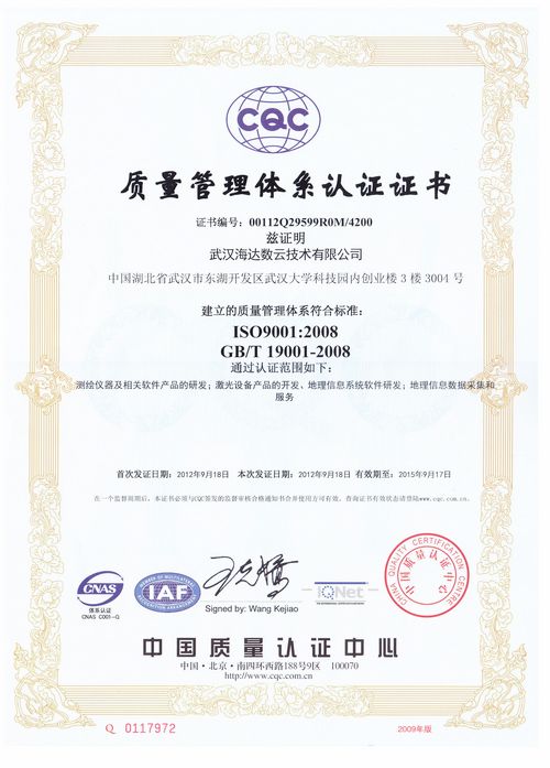 通过ISO9001质量管理体系认证的项目,包括武汉海达数云旗下测绘仪器及相关软件产品、激光设备产品、地理信息系统软件、地理信息数据采集和服务等。这充分说明了武汉海达数云对产品质量的重视,是一家以质量为生命的企业。