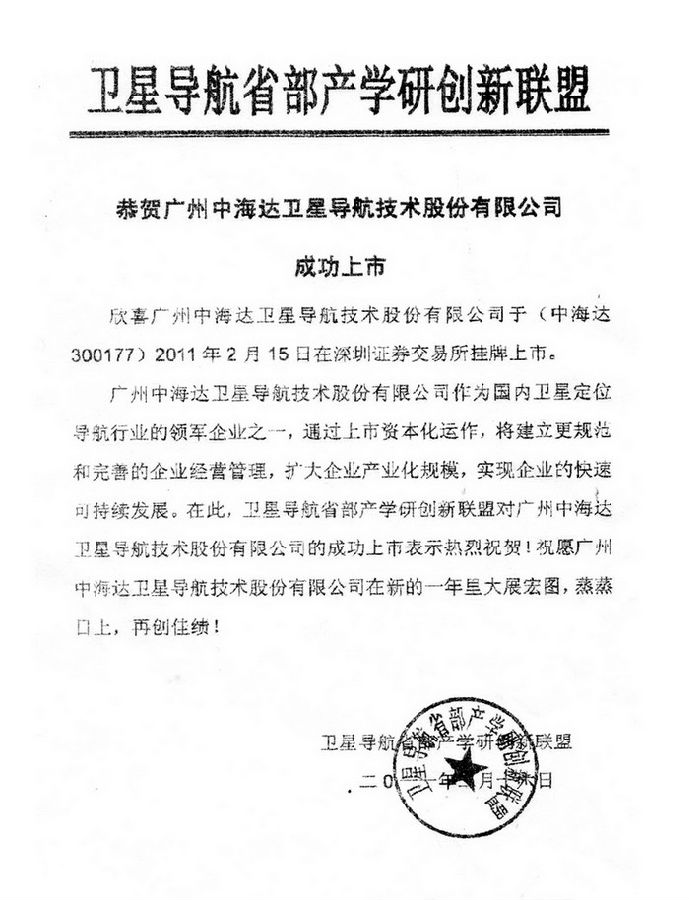 卫星导航省部产学研创新联盟祝贺中海达成功上市