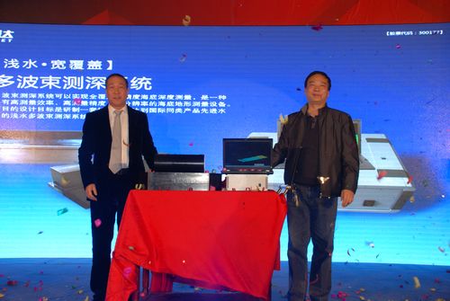 中海达廖定海董事长(左)与陕西省水文局总工程师庞雷(右)为中海达自主知识产权高端海洋探测设备新品多波束揭幕