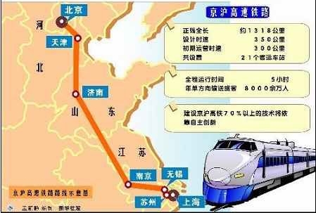 京沪高铁是新中国成立以来一次建设里程最长,投资最大,标准最高的高速铁路。京沪高铁从北京南站出发终止于上海虹桥站,全线纵贯北京、天津、上海三大直辖市和河北、山东、安徽、江苏四省,全长约1318公里,是我国目前最长的客运专线之一。京沪高铁投资总额达到2100亿元,每公里综合造价达到1.59 亿元。京沪高铁与现在的京沪铁路走向大体并行,全线为新建双线,设计时速350公里,初期运营时速300公里,共设置21个客运车站。届时,北京至上海高速列车全程运行时间只需5小时,比目前京沪间特快列车缩短9小时左右,年输送旅客单方向可达8000余万人。而既有京沪线的单向年货运能力也将提高到1.3亿吨以上,从而满足京沪通道客货运输需求,从根本上解决京沪通道运输能力紧张的状况。