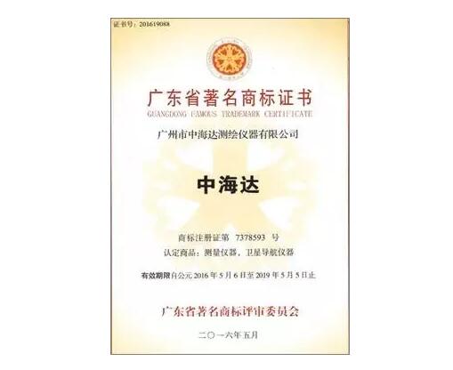 近日,广州市中海达测绘仪器有限公司生产的“中海达”品牌(商标注册证:7378593号)的测量仪器和卫星导航仪器,凭其知名度高、质量优良、信誉度高、行业领先、资质条件过硬脱颖而出,获得广东省著名商标的殊荣。这是中海达拥有的第一个省著名商标。