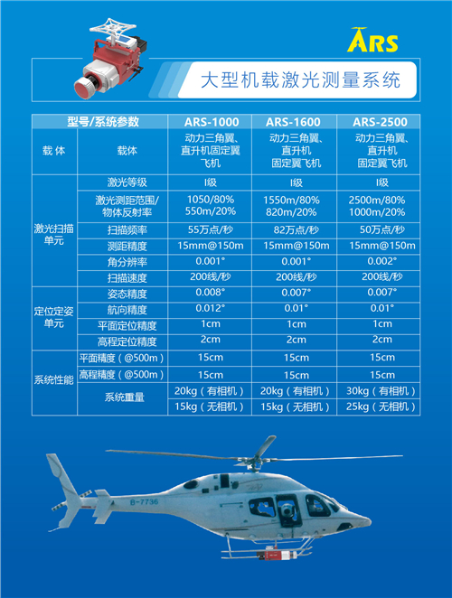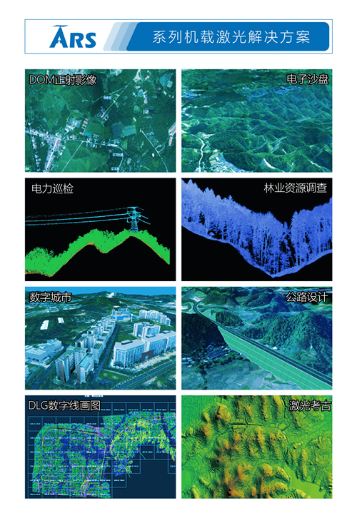 海达数云ARS系列机载激光解决方案包括ARS-UP高清空中全景系统,ARS轻型机载激光测量系统(ARS-100,ARS-100H),ARS大型机载激光测量系统(ARS-1000,ARS-1600,ARS-2500),ARS-OP倾斜摄影测量系统。