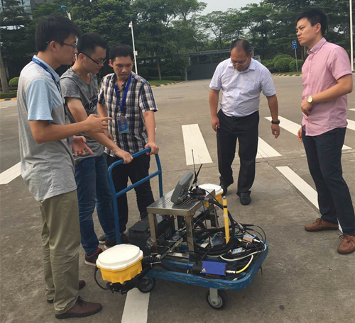 期间,朱宏伟博士对ZD系列工业级平板电脑、抗强振的M30、小型RTK、Q系列手持平板电脑、三维激光扫描、室内定位、无人测量船等产品表现出了浓厚的兴趣,向陪同人员及研发工程师们提出了不少关于产品功能方面的问题。在参观番禺分工厂的过程中,朱宏伟博士聆听了“样品试制”、“来料检验控制”、“生产流水线控制”、“成品检验”等关键环节的介绍后,对产品质量把控效果上给予了充分的肯定及赞许。而在参观中海达定位公司研发部期间,研发人员在室外向朱宏伟博士展示了中海达CFG桩打桩系统。