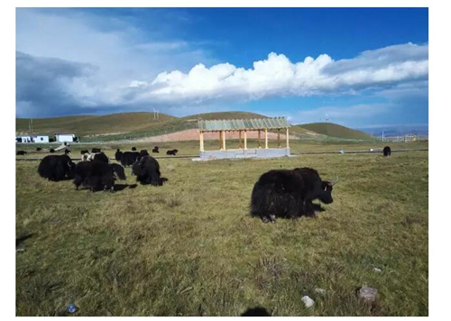 蓝天白云下的牦牛群