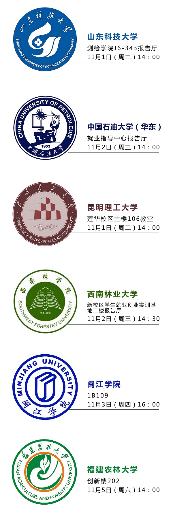 本次在山东、云南、福建三省,我们挑选了6所高校进行校园招聘宣讲会,小伙伴们千万不要错过哦。