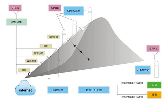 滑坡地质灾害预警系统物联网将传感器和GNSS接收机进行组合,对崩塌、滑坡的成灾条件、过程的监测和地质灾害防治效果的反馈监测,其内容包括: