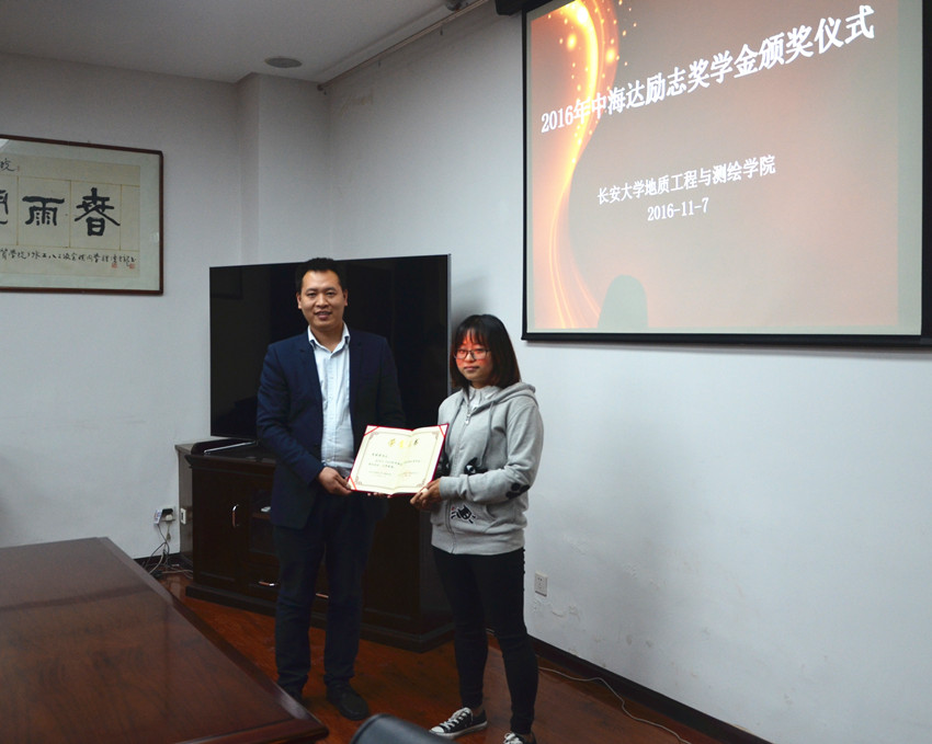 11月7日晚7点,长安大学地质工程与测绘学院(下称长安大学地测学院)在学院会议室举行了2015-2016学年中海达励志奖学金颁发仪式。长安大学地测学院副院长王利、测绘科学与工程系主任田永瑞、测绘科学与工程系副主任张双成、学工办辅导员朱倩、鞠成婷老师,中海达西安分公司总经理余斌,以及15位获奖同学出席颁奖仪式。