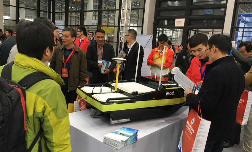 进入展区右侧,首先是海洋探测展区,其中展出的iBoat BM1智能无人测量船,其专业级的船体设计、高性能的测深模块、高精度的定位模块、控制采集软件均由中海达自主设计、研发。