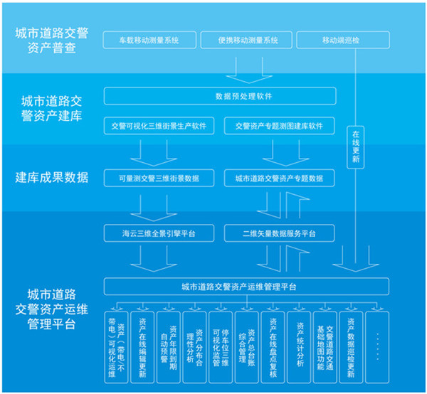 从城市道路交警资产设施的数据采集生产,到可视化交警资产运维管理平台建设,海达数云为用户提供一体化的解决方案,总体技术线路如下图所示: