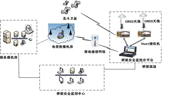 该系统根据桥梁的特点和需求观测的技术指标,在桥梁上安装数据采集的传感器系统,传感器系统将不同采样频率、不同类型的监测数据测量后,在采集平台进行集中采集和处理,然后统一远程传输到监控中心。