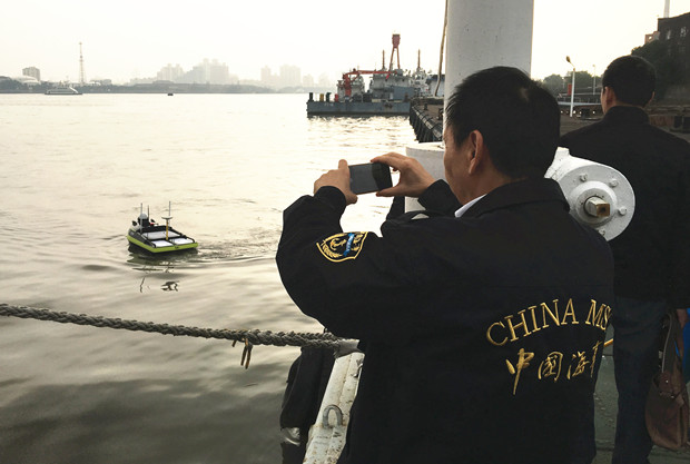 此次演示选址黄浦江,主要是因为黄浦江是上海的重要水道,通航船只较多,航运条件复杂,而且涨落潮时流速大,在此处演示更能体现出iBoat智能无人测量船的优异性能。
