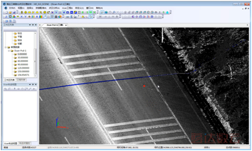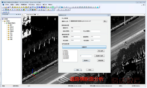 使用高精度车载三维激光移动测量系统,精确扫描并获取道路面的激光点云数据,通过前期布设的四等高程水准点(间距600米),进行高程改正,保证激光点云高程精度控制在大中修测量标准范围内(高程精度优于3cm)。最后,通过数据生产软件,半自动化处理生产道路纵横断面数据与路面地形图。
