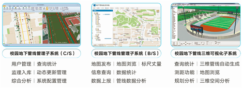 校园地下管线信息系统利用管线探测技术、三维建模技术和地理信息系统技术,把校园的地下管线、地上建筑、基础设施及地形三维数字化,为校园提供准确的地理信息基础资料。同时系统通过管线入库、管线编辑、管线查询统计、空间分析、基础设施管理、二三维展示等多种功能,提高校园后勤部门的综合管理水平,为今后的智慧校园建设和发展打下了良好的基础。
