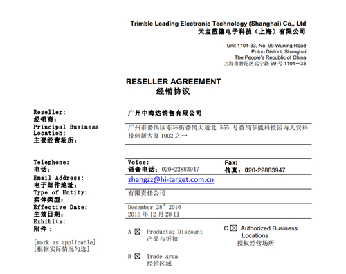 近日,中海达旗下子公司广州中海达销售有限公司(以下称销售公司)凭借优秀的营销网络和市场竞争力,与天宝莅德电子科技(上海)有限公司签署代理协议,获得2017年中国区域内天宝光谱精仪产品的总代理权。