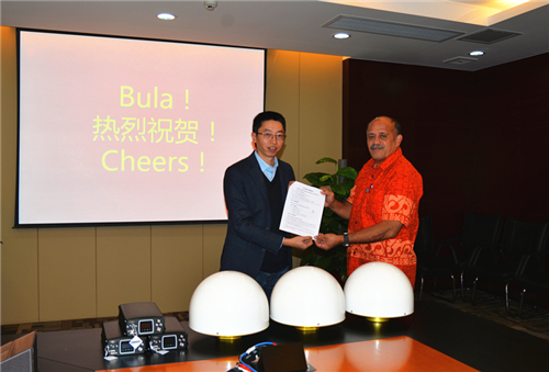 中海达副总裁鲍志雄(左)与斐济土地与矿产资源管理部项目经理Paserio Samisoni交换捐赠协议