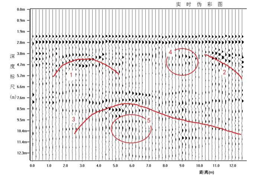 (3)从原始图上看,标号1、标号2、标号3这两条红线对应的图形为分层趋势线。同时标号1对应的波形,也有可能是对应是空洞。标号3对应的趋势线,跨度很大,不排除现场有大型金属物或高的金属杆影响。标号4对应的位置,可能为脱空或者是含水较大区域。标号5对应的位置可能为脱空或都是含水较大区域。