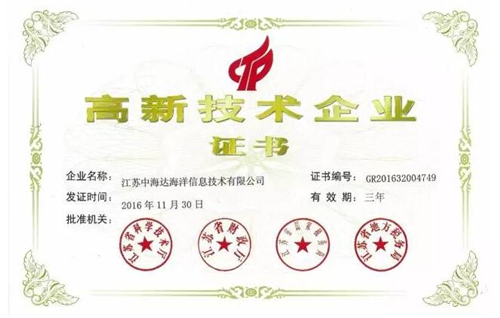 近日,中海达子公司江苏中海达海洋信息技术有限公司(下称海洋公司)收到由江苏省科学技术厅、江苏省财政厅、江苏省国家税务局、江苏省地方税务局联合颁发的《高新技术企业证书》,证书编号GR201632004749,发证时间2016年11月30日,证书有效期三年。