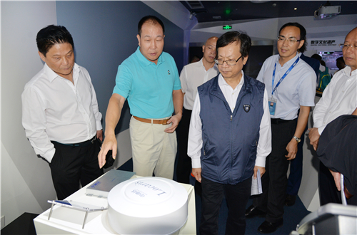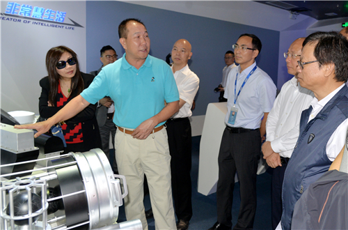 董事长廖定海(左二)向香港访问团代表介绍室内定位产品