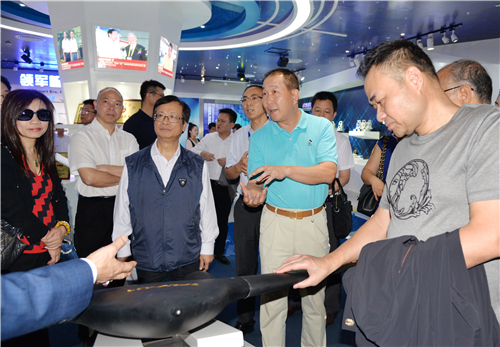 董事长廖定海(左二)向香港代表团介绍超短基线定位系统