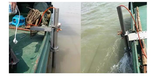 两款仪器均采用舷侧安装方式,尽量安装于距船艏相同距离的同一平面上。安装过程中通过使用支架来确保仪器不会随船前行而发生转向,安装时确保换能器探头完全入水,不会受到波浪涌动和发动机产生的气泡影响。
