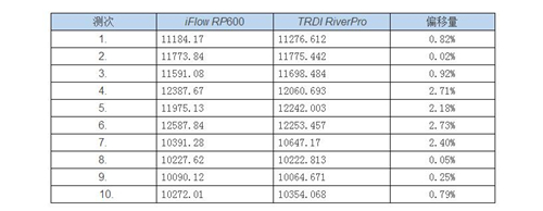 乌江进行了10个测次的测量,对 iFlow RP600 和 TRDI RiverPro 流量测试结果进行对比,结果如下表所示:
