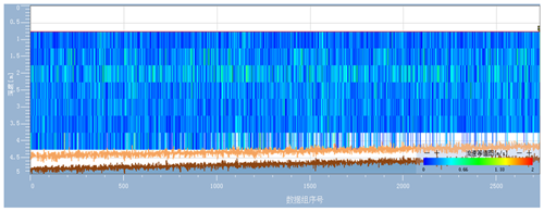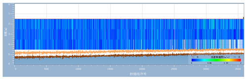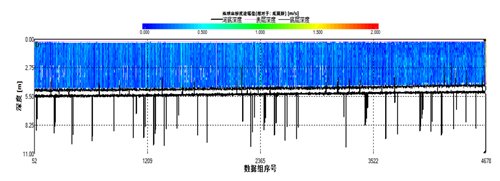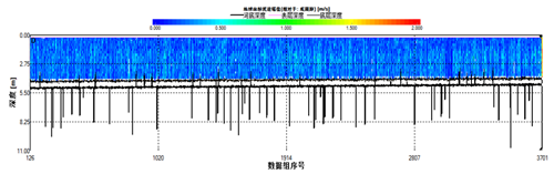 iFlow_RP600和TRDI RiverPro均可通过流速等值图直观查看河底深度信息与所测流速单元层流速幅值的变化趋势。当日11:30分至12:30分采集数据约3610s,TRDI RiverPro采用自适应的信号发射频率,测得4678组数据组,现场流速等值图如图1-1所示:
