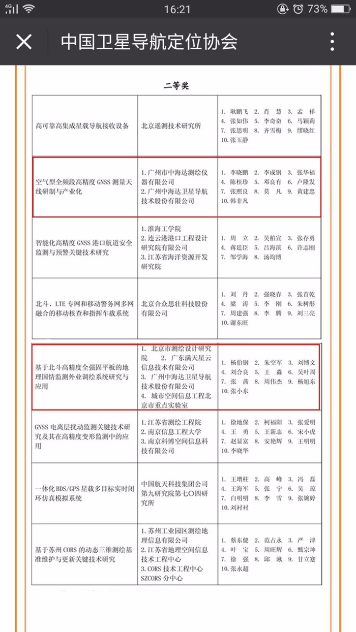 8月30日,中国卫星导航定位协会发布2017年度卫星导航定位科学技术奖评选结果公示,由中海达及旗下子公司中海达测绘仪器有限公司、广东满天星云信息技术有限公司参与完成的 “空气型全频段高精度GNSS测量天线研制与产业化”和“基于北斗高精度全强固平板的地理国情监测外业调绘系统研究与应用”项目获得2017年度卫星导航定位科学技术进步二等奖。
