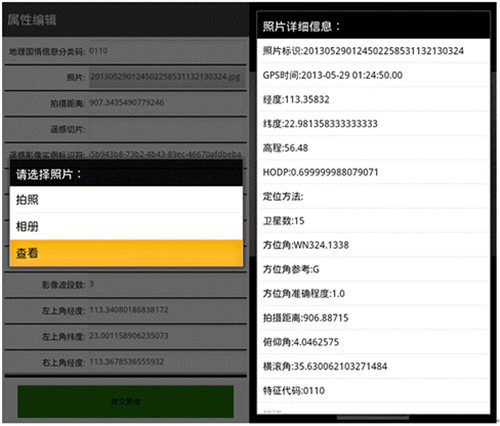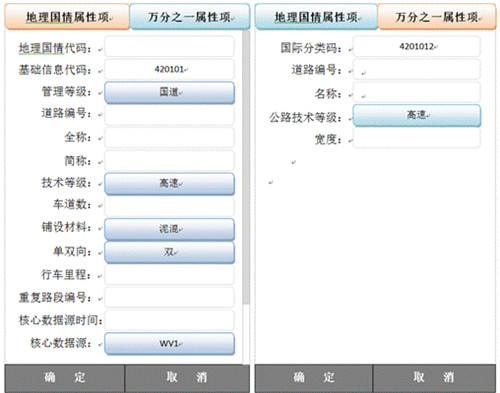 在野外的核查过程中,当发现某一对象的现实属性数据与实现属性数据不符时,可选择该对象,然后进行属性编辑。在进行属性数据编辑时,将分为“地理国情属性项”及“万分之一属性项”两部分内容,可分别填写完成后保存即可。虽然在编辑时分项进行了录入,但在数据的内部组织管理中,仍为同一数据源,保证数据的一致性和完整性。如下图所示: