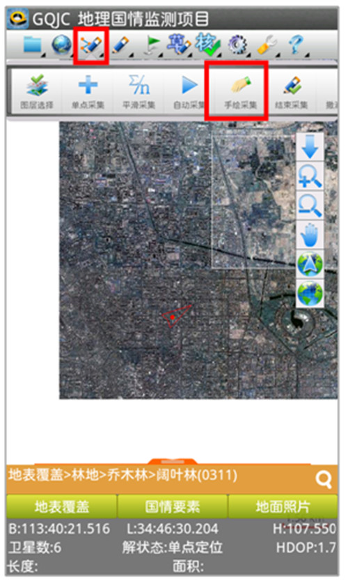 系统设计提供两种方式进行现场要素标绘,一种为电子草图,一种为坐标采集。前者主要通过类似画图板的功能实现现场地形地貌的概略标注说明,后期再进行图形的完善调绘,此方法较为简洁快速,但存在后续工作;而后者通过准确的空间位置获取手段,真实准确地一次性完成图形的调绘工作,此方法较为耗时复杂,但可现场成图。现场将根据实际情况选择标绘方式,也可两者结合使用,灵活搭配。