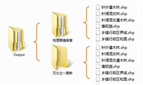 野外数据采集更新完成后,只需要执行软件的“分类输出”功能,即可将当前作业内容分离出“地理国情普查”及“万分之一更新”两套shp数据至“Output”文件夹中。
