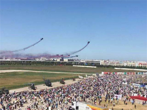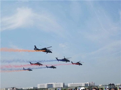 多架飞机腾空升起,带出的烟雾给蓝色的天空一抹亮色,难道是阅兵?一看日历,国庆还没到呀,原来是第四届中国天津国际直升机博览会现场。