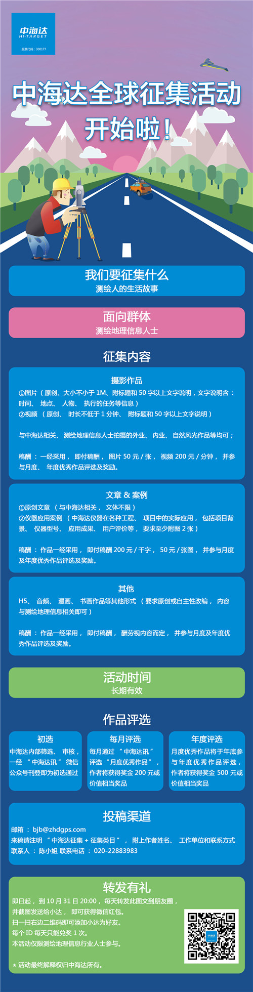 2.每月评选:每月通过“中海达讯”评选当月最具人气作品,票数最高的3项作品,作者将获得奖金200元或价值相当奖品。