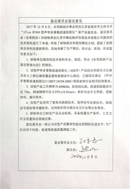 在本次产品鉴定会上,鉴定委员会对研制单位江苏中海达海洋信息技术有限公司提供的技术资料进行了审查,听取了研制报告和使用情况介绍,查验了检测报告和科技查新报告,实地考察了生产情况,经讨论、质询,鉴定委员会一致认为该型产品整体性能达到国际先进水平,可广泛应用于河流、航道等流速流量测验工作。