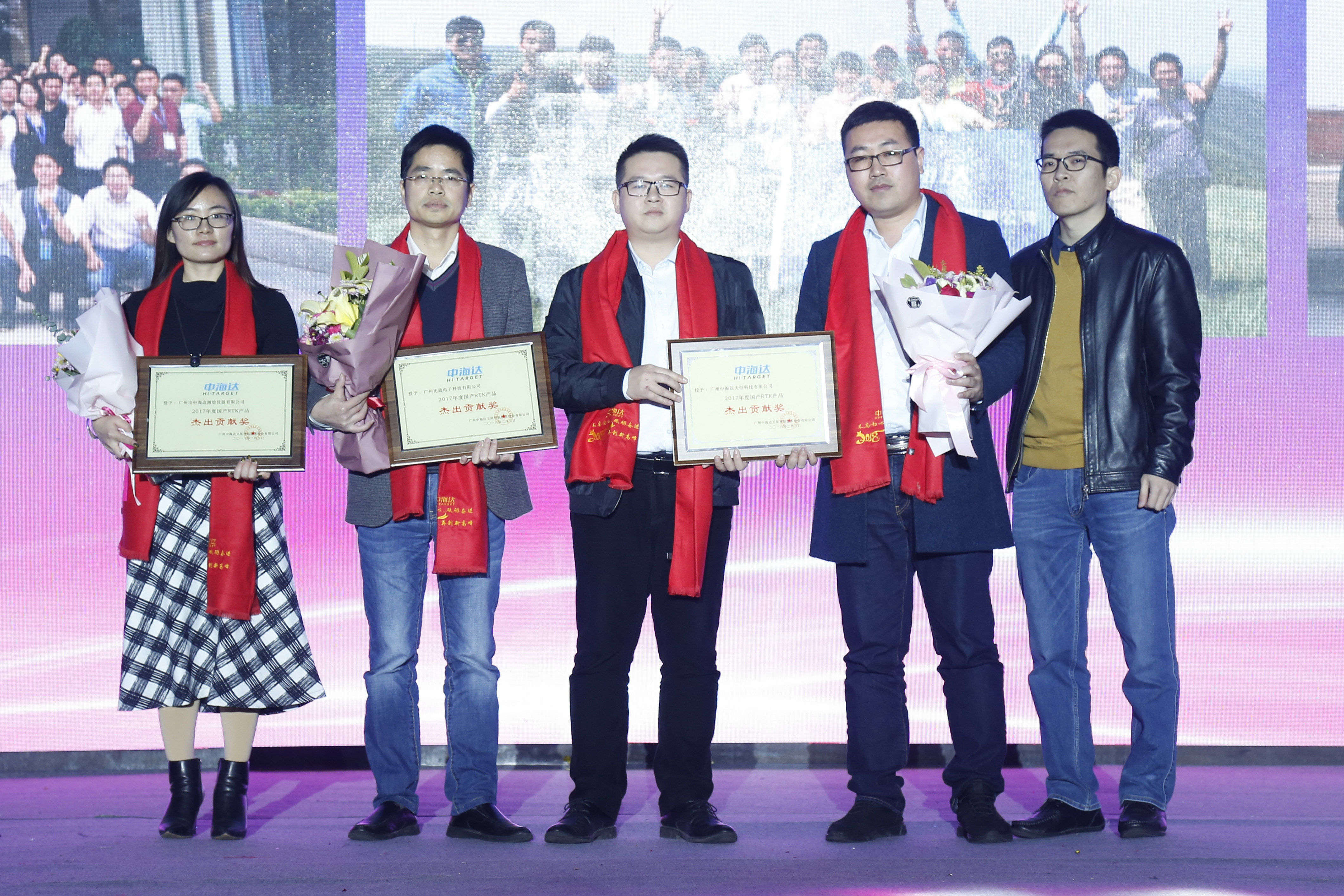 董事长兼总裁廖定海(左二),海洋公司、定位公司总经理李洪江(左一)为年度中海达品牌十大影响力代理商颁奖