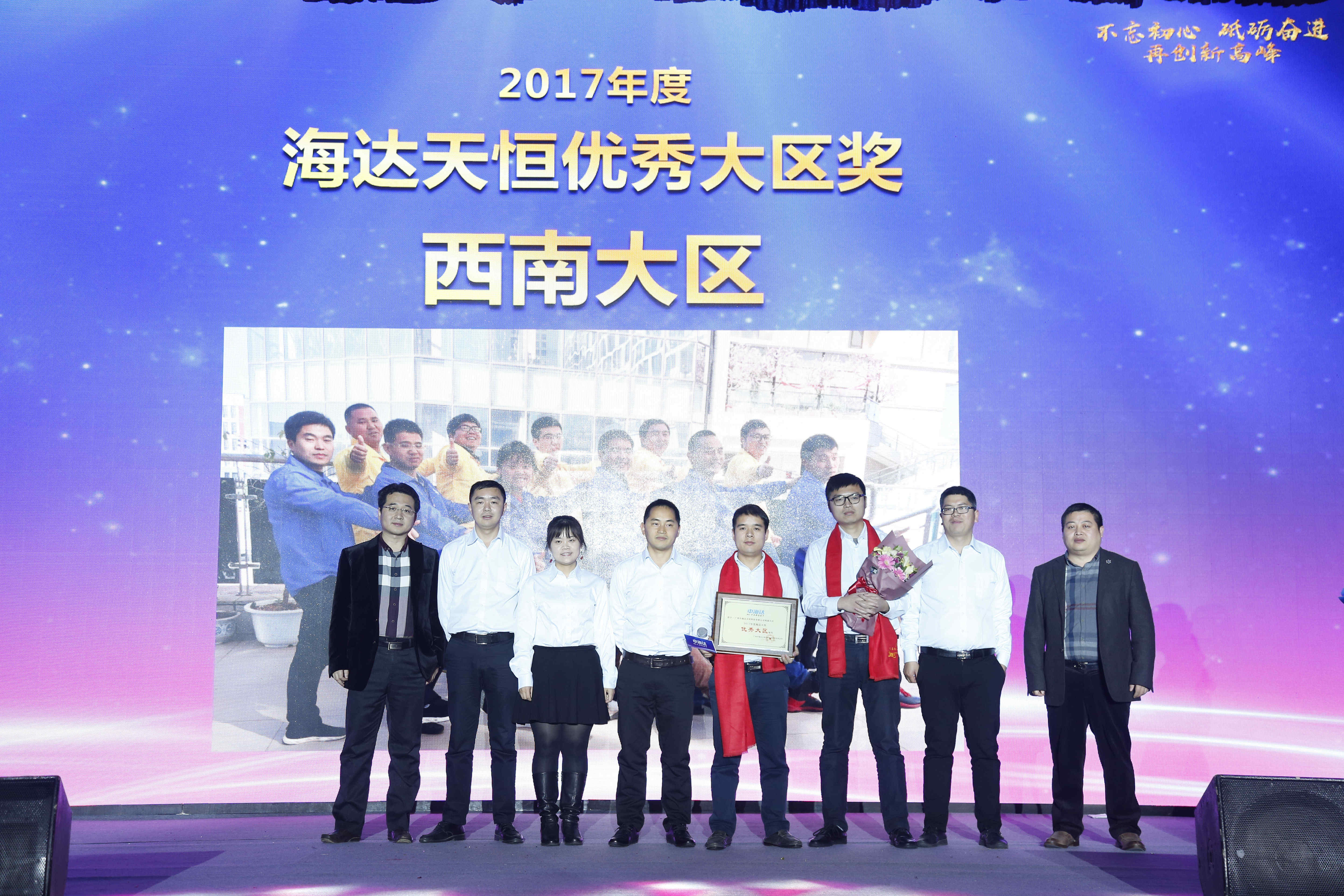 海达天恒总经理李刚(左一)、副总经理应晓伟(右一)为西南大区颁发年度海达天恒优秀大区奖