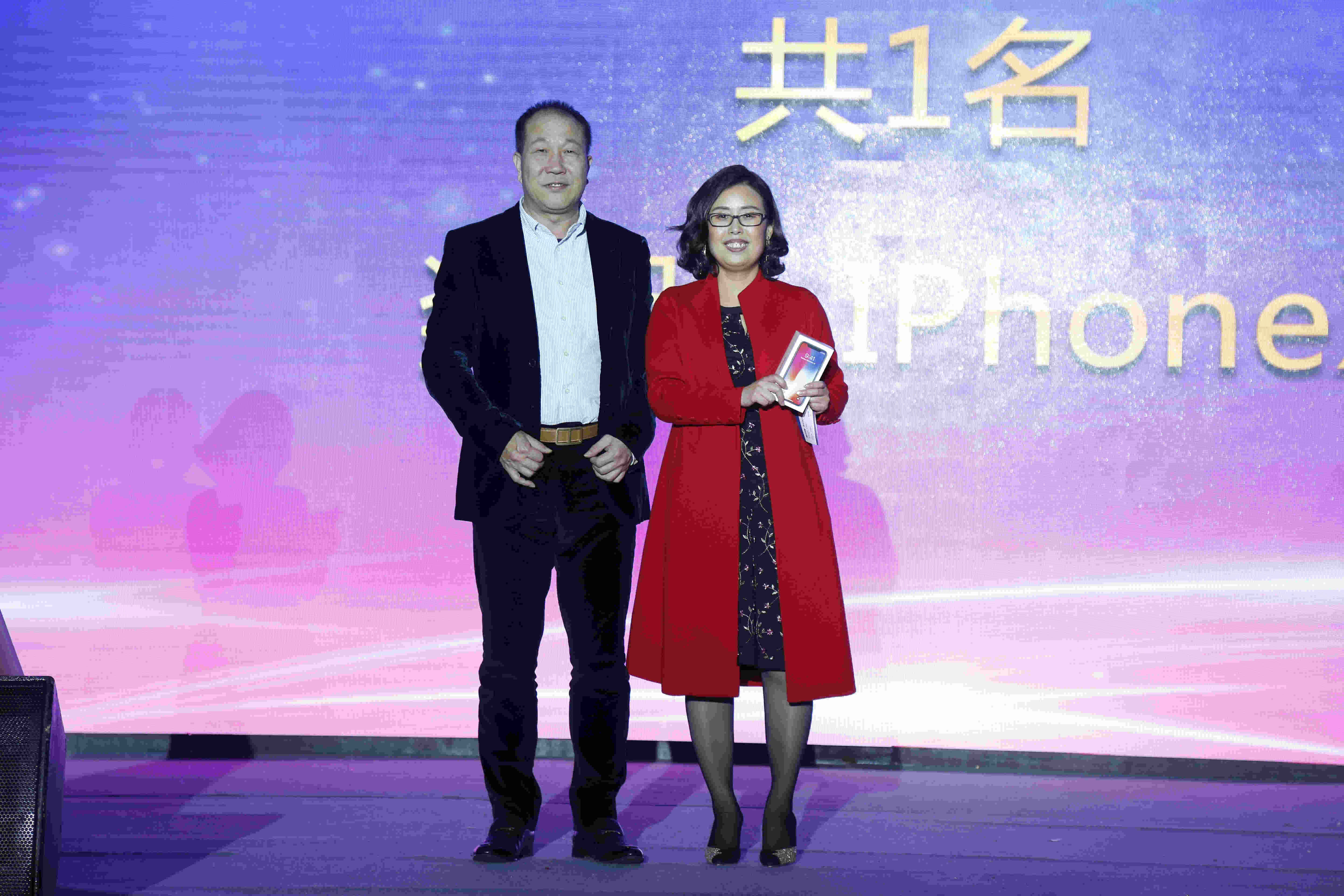 董事长兼总裁廖定海为登峰造极奖获得者颁发奖品iPhone X