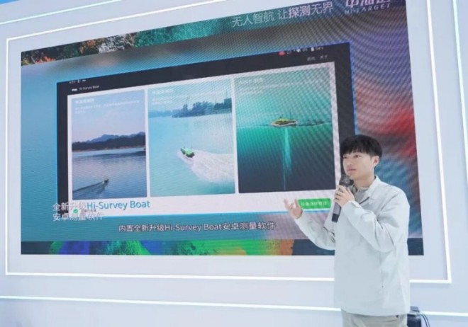 开展首日上午,中海达在展会现场隆重发布了iBoat BSC无人船多波束测量系统。发布会由中海达集团营销中心副总经理李加强主持,测量装备事业部产品经理汪瑞就新品做了详尽报告。