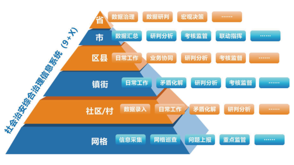 面向政法线条,以综治工作关注数据为核心,以综治日常工作为基础,以综治业务需要为拓展,形成9+X 建设模式,适用于省、市、县、镇、村五级综治工作部门,解决工作无抓手、数据掌握不清、矛盾化解被动处置、研判分析无数据支撑等问题,通过信息化技术提升政法综治工作现代化水平。