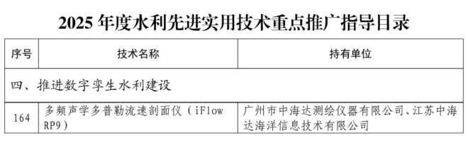 近日,水利部科技推广中心正式发布《2025年度水利先进实用技术重点推广指导目录》,中海达自主研发的多频声学多普勒流速剖面仪(iFlow RP9)凭借在多频融合架构、智能算法集成等方面的核心创新,以及在实际应用中的卓越表现成功入选。